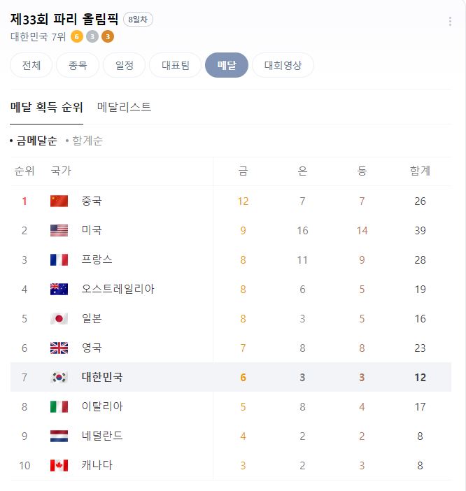 | 역대 올림픽 한국 종합 순위 메달 수 (0) | 2024.08.11 |