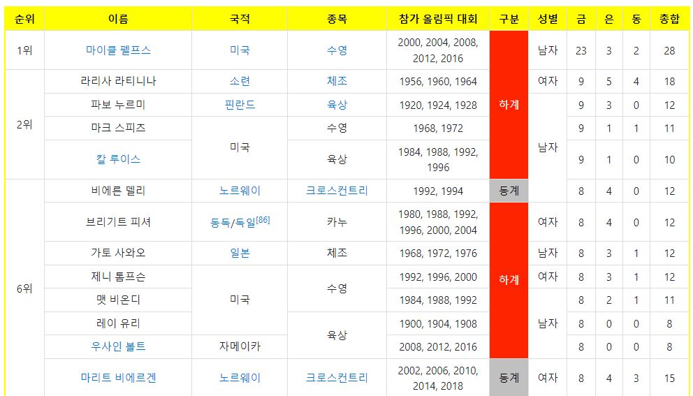 올림픽 최대 금메달 역대 최다 메달리스트 순위