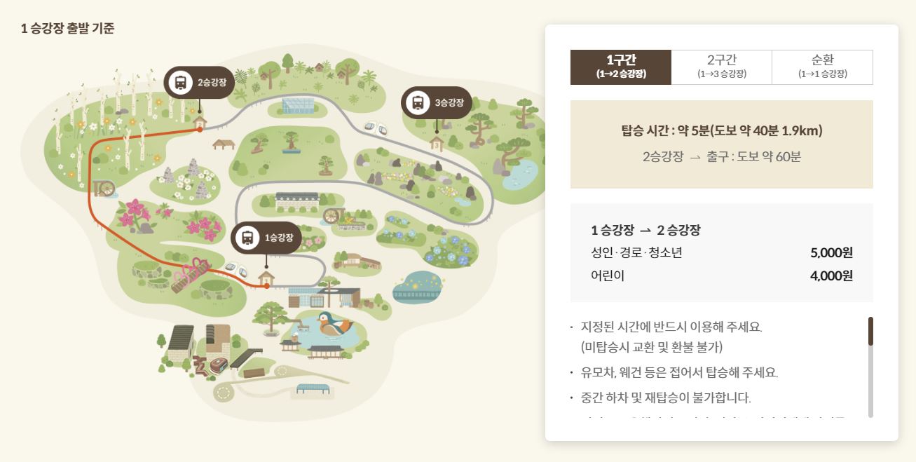 - 탑승 규칙 : 유모차, 웨건 등은 탑승 전에 접어야 합니다. 중간 하차 및 재탑승은 불가능합니다.
